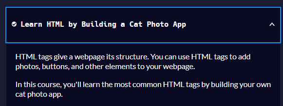 이 과정에서는 자신만의 고양이 사진 앱을 구축하여 가장 일반적인 HTML 태그를 배우게 됩니다.
